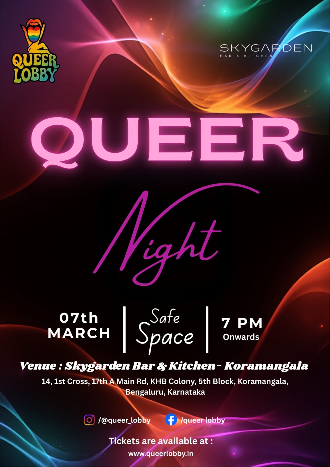 Get ready for an unforgettable evening at Queer Night, a vibrant celebration of identity, freedom, and community. Hosted by Queer Lobby at Skygarden Bar & Kitchen, Koramangala, this night is curated exclusively to offer a safe, welcoming, and affirming space for the LGBTQIA+ community and allies.